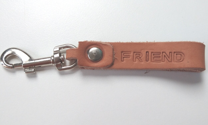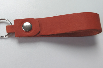 Sleutelhanger in fuchsia, getakeld met zwart leder.