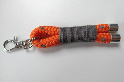 Sleutelhanger in neon oranje, getakeld met grijze hennep.
