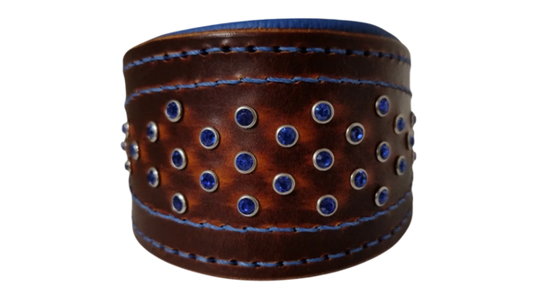 - Deze leuke halsband is gemaakt in donkerbruin tuigleder en bezet met blauwe strass-steentjes.