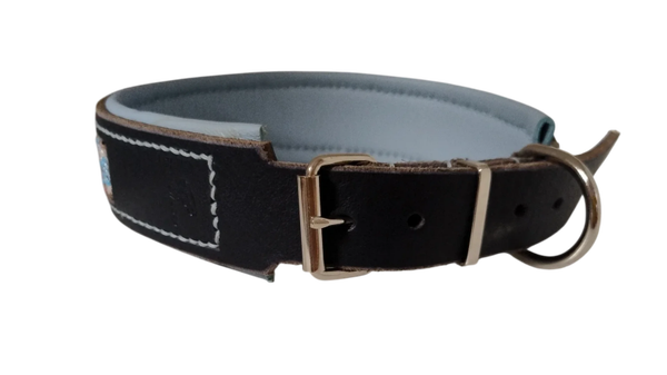 Zwart lederen halsband bezet met echte miyuki glaskraaltjes. Voorzien van een lichtblauwe nappa voering voor een zacht gevoel aan de keel.