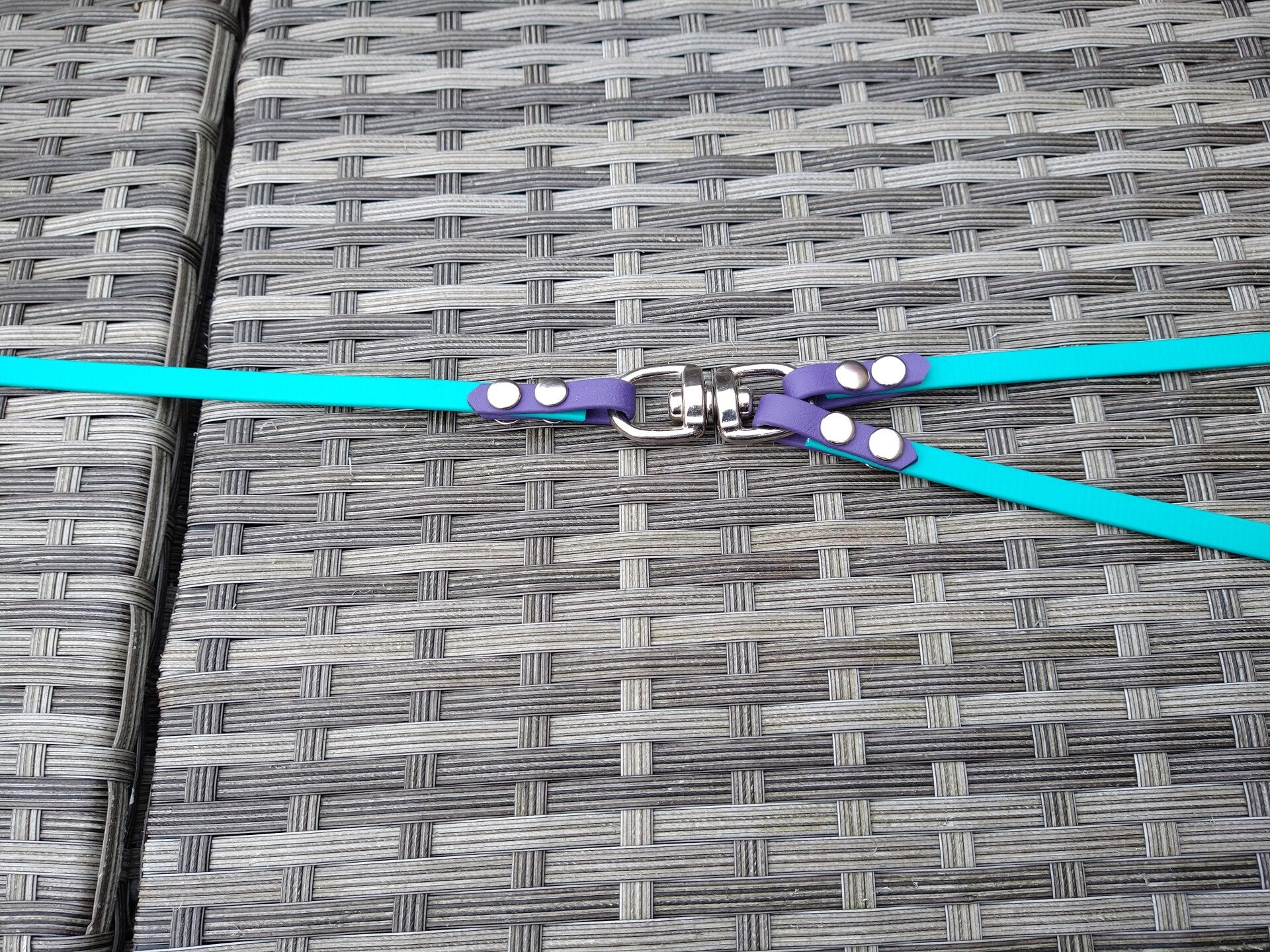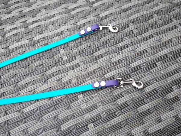 Voor deze leibanden heb je de mogelijkheid om 2 kleurtjes te kiezen. Ongeveer halverwege is er een splitsing in 2 aparte lijnen. Zo kan je beide honden met 1 leiband vasthouden en raken de lijnen niet verstrikt in elkaar.